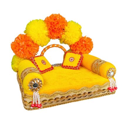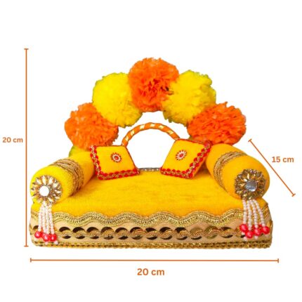 Laddu Gopal Bed and Singhasan with Flowers (Yellow, Orange, Golden) (Wood and Soft Silky Velvet Cloth)