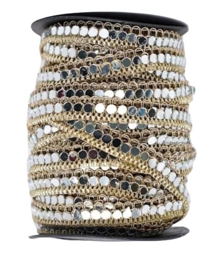 Decorative Mirror Lace Trim, 9 Metres, Gold Base with Silver Mirrors, for Saree Dupatta Kurti and Art & Craft Lace Reel