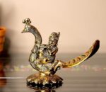 This exquisite handcrafted Laddu Gopal figurine features Lord Krishna playing the flute (Basuri), beautifully perched on a majestic peacock. Crafted from high-quality metal with a stunning gold finish, this 15 cm decorative showpiece adds a touch of divine elegance to any space. Perfect for enhancing the spiritual ambiance of your home or gifting to loved ones, it showcases intricate detailing and fine craftsmanship, making it a timeless addition to your collection. Ideal for pujas, festivals, or as a thoughtful home décor piece.