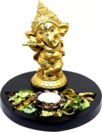 Handcrafted Lord Ganesha Statue with Tealight Holder – Wooden Base Decorative Showpiece, 16 cm (Polyresin & Wood, Gold Finish)