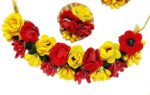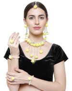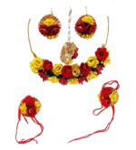 - xquisite Design: Floret Gota Patti work on the necklace, earrings, and maang tika bracelet adds a traditional touch.