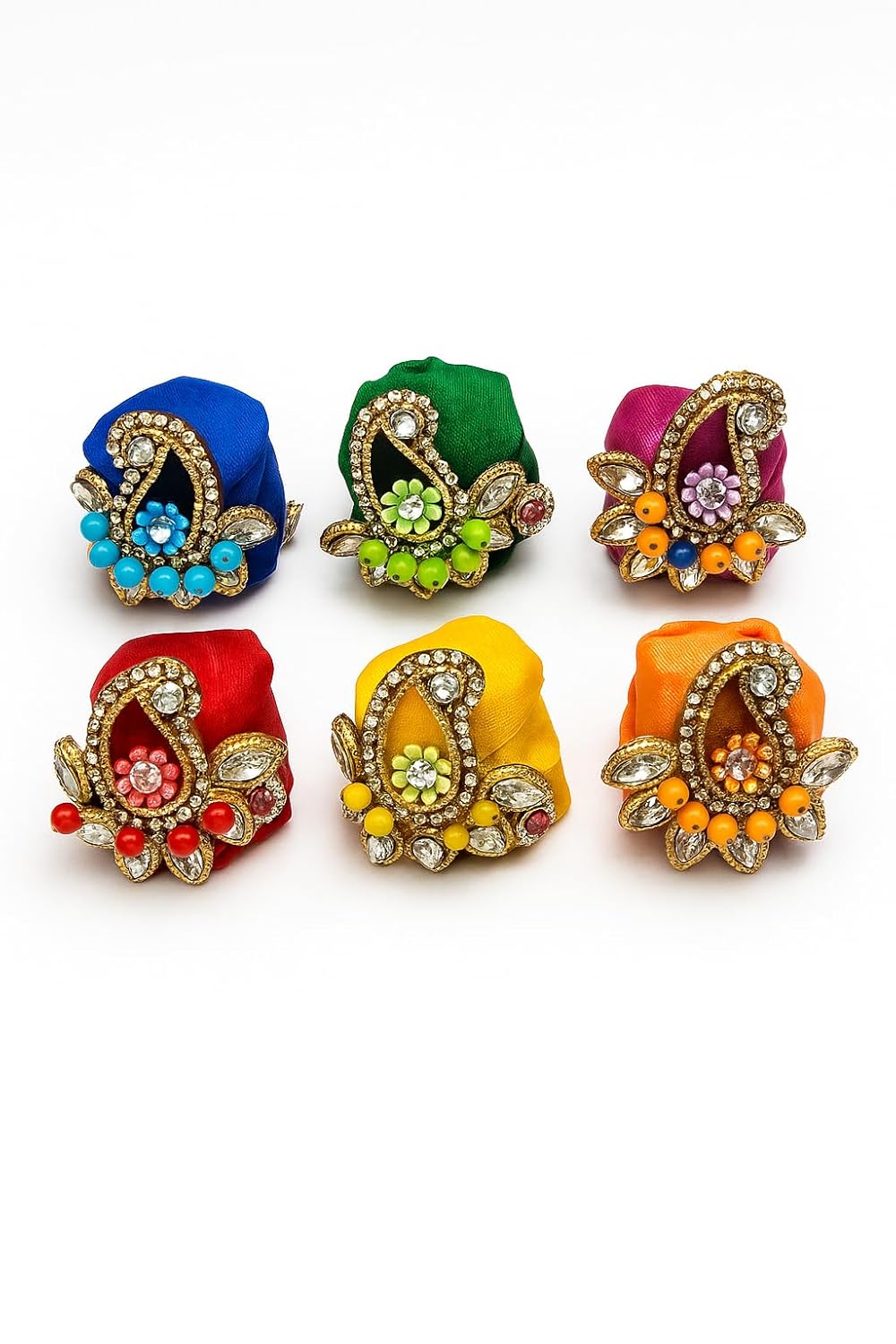 - Set of 6 Multicolour Pagdi / Mukuts – 6 vibrant colours in one pack, perfect to match daily dress / poshak of Laddu Gopal, Kanha Ji, Mata Rani. Available in multiple sizes ranging from 0 no. to 4 no. Premium Mukut Set : Laddu Gopal Poshak/Dress Premium Pagdi/Mukut Shringar (Pack of 6) (Ladoo Gopal Accessories). Ornate Flower & Bead Detailing – Beautiful decorative work with stones, beads and floral motif that adds elegance to the mukut; enhances the idol’s look. Suitable for Festivals & Daily Worship – Perfect accessory for Navratri, Janmashtami, Diwali, Puja, Temples, Gifts etc.; easy to use and maintain.