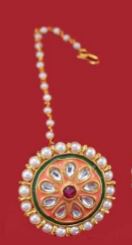 Pearl Chain: Attached to a matching pearl-beaded string (Dori) that secures the ornament to the hair, ensuring it sits perfectly on the forehead.