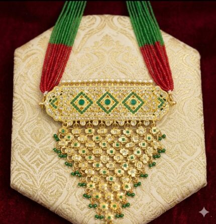 Green Beaded Strings: The necklace is held by multiple strands of green seed beads, a classic element in Rajasthani jewelry that adds to its ethnic charm.