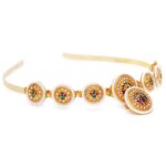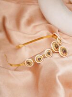 Design & Pattern: Features a broad, curved golden plate with a rich beaded texture (Gajra work) and a prominent circular floral motif at the center.
