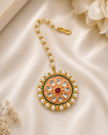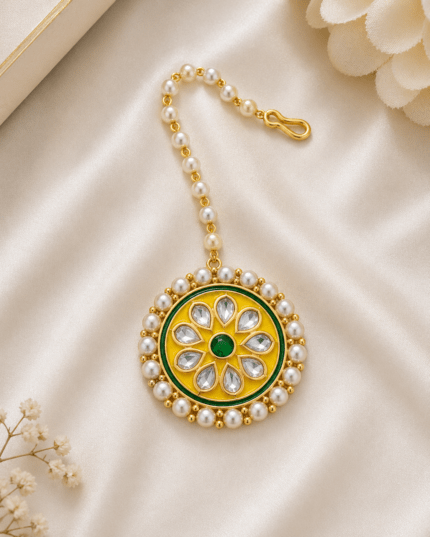 Pearl Chain: Attached to a matching pearl-beaded string (Dori) that secures the ornament to the hair, ensuring it sits perfectly on the forehead.
