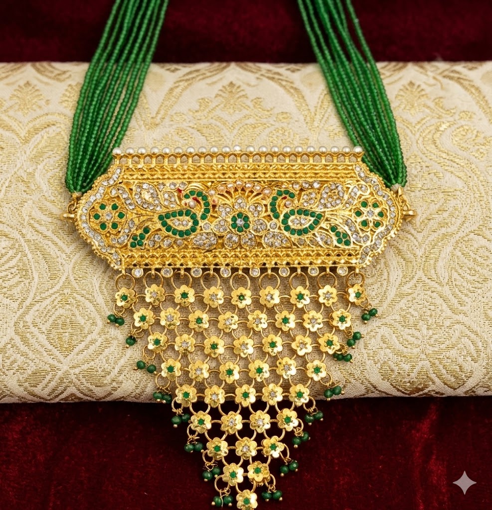 Step into the regal world of Rajasthan with our breathtaking Traditional Rajputi Aad Necklace, featuring an exquisite green peacock motif that symbolizes grace, beauty, and good fortune in Indian culture. This magnificent high-neck jewelry piece embodies the grandeur of Rajputana traditions, making it a perfect choice for brides and jewelry connoisseurs seeking authentic ethnic elegance.