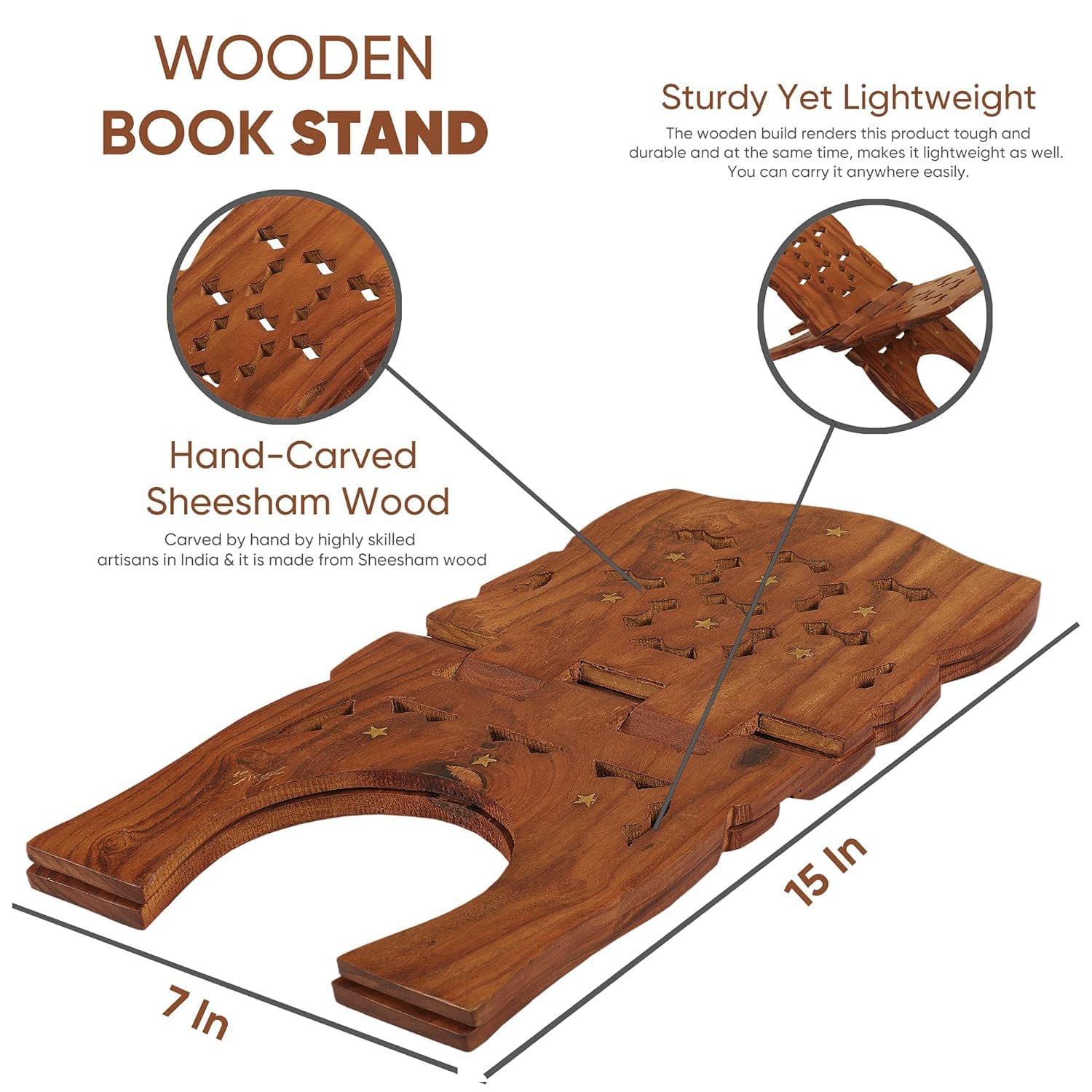 Wooden Hand Carved Book Stand Foldable Sheesham Wood Rehal for Holy Books, Brown, 15 x 7 Inches