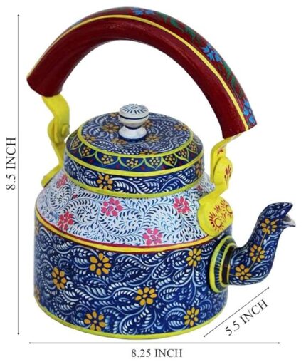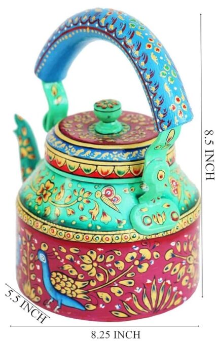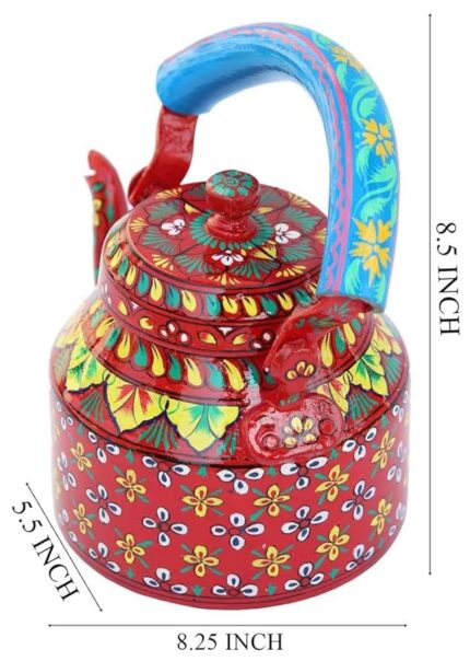 Hand-Painted Design: Features vibrant, intricate hand-painted patterns for a unique, artistic touch. Durable Aluminium Construction: Made from high-quality aluminium, ensuring long-lasting durability and easy maintenance. 500 ML Capacity: Perfect size for serving tea, coffee, or any hot beverage for 2-3 people. Versatile Use: Ideal for both everyday use and special occasions, or as a beautiful home décor piece. Traditional & Elegant: Adds a traditional charm and colorful accent to your kitchen or living room. Easy to Clean: Lightweight and easy to maintain, perfect for regular use without hassle