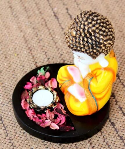 Handcrafted Little Baby Monk with Tealight Holder & Wooden Base – 22 cm Decorative Polyresin Showpiece (Multicolor)