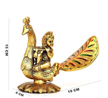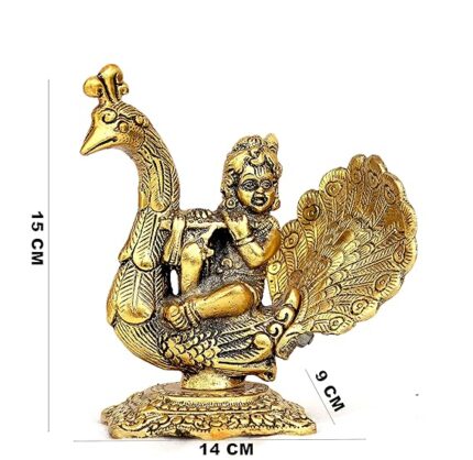 Handcrafted Design: Intricately crafted by skilled artisans, featuring Lord Krishna (Laddu Gopal) playing the flute, perched on a beautifully detailed peacock base.
